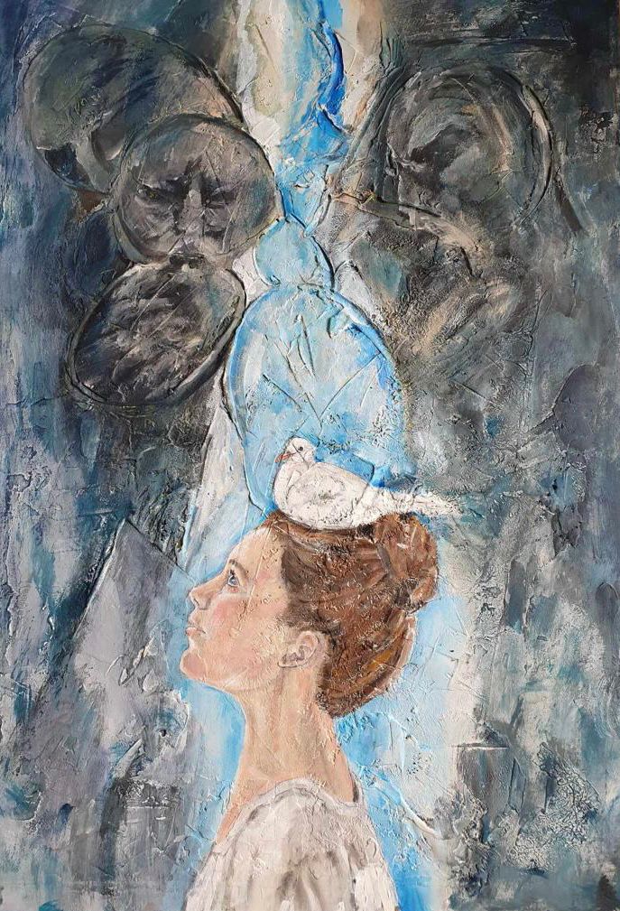 Dit doek is geschilderd met veel relief. Het suggereert een kloof met reuzen aan beide kanten. In Jozua lees je dat de reuzen moesten worden verslagen. De reuzen staan voor angsten, problemen of situaties in ons leven waar we mee moeten dealen. God wil dat de duistere machten die ons bang maken in ons denken moeten verdwijnen. Dat we vrij zijn! In ons denken mag de Heilige Geest met Zijn nieuwe gedachten ons vervullen. Ik schilderde de duif ( symbool van de H.G.) op haar hoofd waar die eigenlijk een soort geinig nestje heeft gebouwd. Dat we mogen weten dat Hij ALTIJD bij ons en ons helpt de reuzen te verslaan.