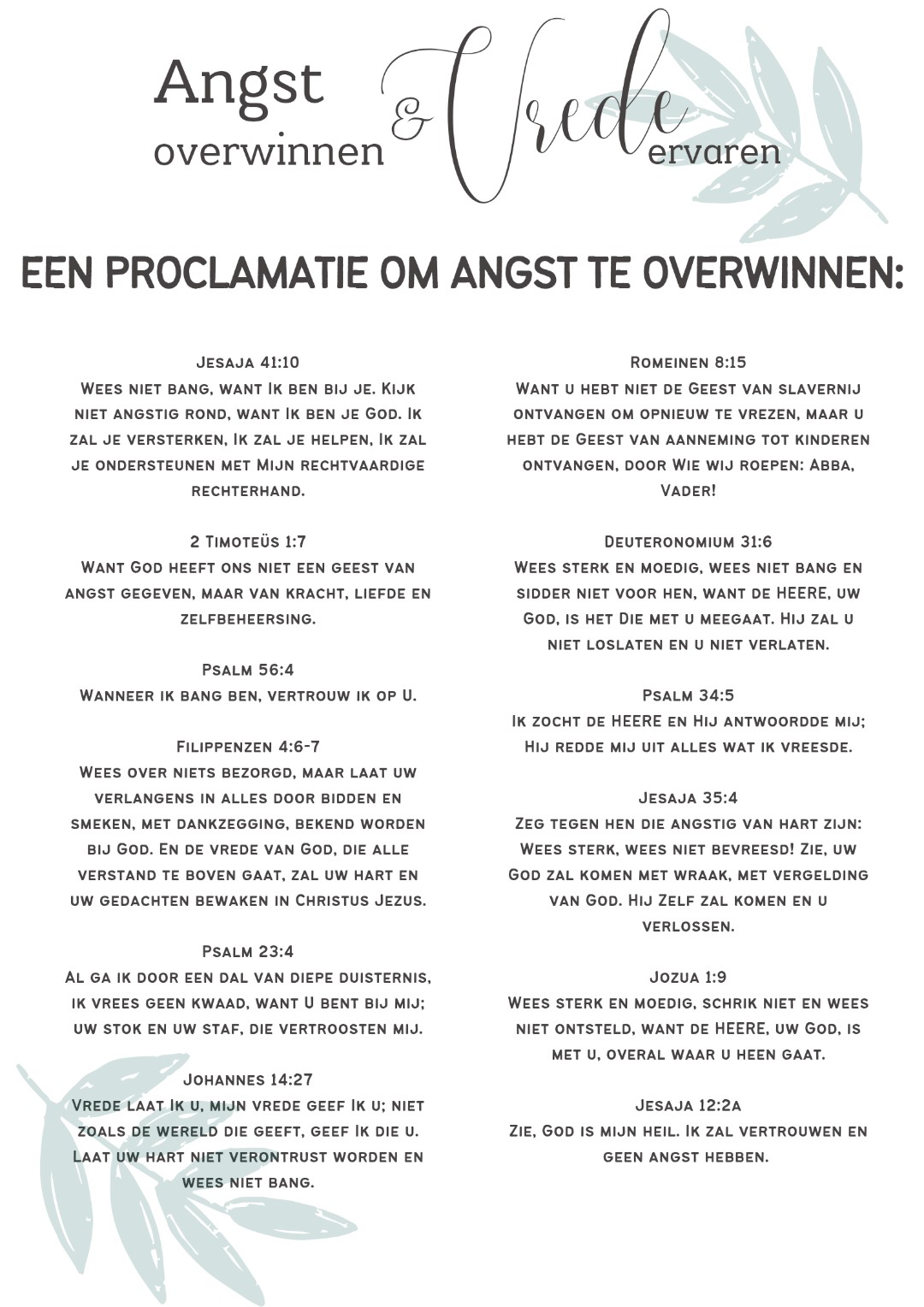 Daarom wil ik je vandaag bemoedigen met 10 Bijbelteksten. Het is zo belangrijk om de waarheid van God tegenover je angsten te zetten zodat je er overwinning over behaalt. Het liefst hardop, want dat is proclamatie. Je spreekt Gods eigen woorden uit. En dat mist nooit zijn doel (Jesaja 55:11). Daarnaast ontstaat er geloof in je hart als je het hoort (Romeinen 10:17). Jezus deed dat ook in Lucas 4 ook. Op iedere aanval zei Hij hardop: want er staat geschreven…